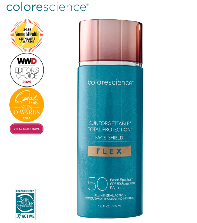 Colorescience Face Shield Flex™ es un protector solar mineral ligero con cobertura de color que iguala inmediatamente el tono de la piel para un acabado uniforme y natural. Esta fórmula hidratante, rica en antioxidantes y con activos minerales, está impulsada por la tecnología patentada EnviroScreen®, lo que significa una defensa completa contra los rayos UVA/UVB, la luz azul, la contaminación y la radiación infrarroja, combinada con antioxidantes avanzados e ingredientes nutritivos e hidratantes para una salud cutánea a largo plazo.